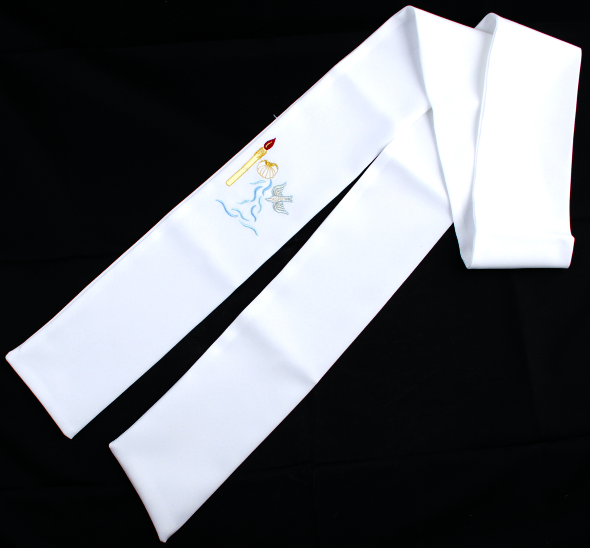 White baptismal stole with embroidered candle and dove