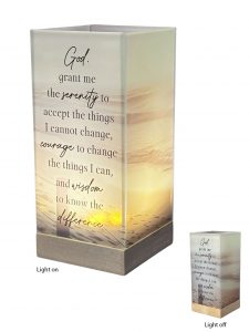 A beautiful LED glass lamp with wood base, features timer with 6 hours on and 18 hours off and measures 80 x 80 x 155mm high.