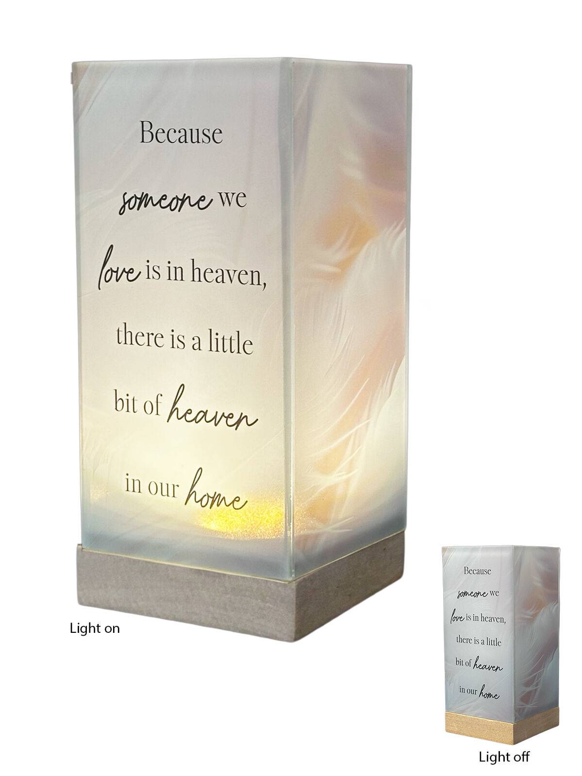 A beautiful LED glass lamp with wood base, features timer with 6 hours on and 18 hours off and measures 80 x 80 x 155mm high.