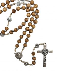 A beautiful olive wood rosary bead (6mm) with St Benedict centre piece, comes boxed